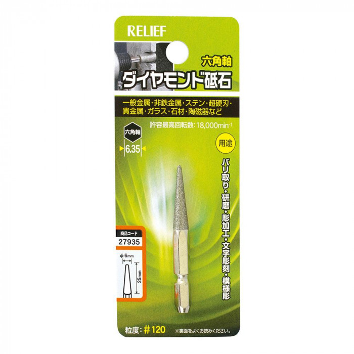 fk094igrjs一般金属・非鉄金属・ステン・超硬刃・貴金属・ガラス・石材・陶磁器などにお使いください サイズ 先端径:Φ6mm、先端長:25mm 個装サイズ:5×13×2cm 重量 個装重量:21g 仕様 粒度:♯120 六角軸:6.35mm 製造国 日本 バリ取り・研磨・彫加工・文字彫刻・模様彫に 一般金属・非鉄金属・ステン・超硬刃・貴金属・ガラス・石材・陶磁器などにお使いください