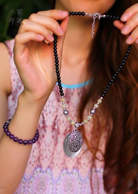 Material: amber, beads, copper alloy, imported stones, colored thread
