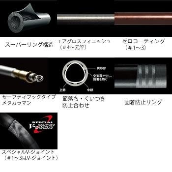 스페셜V-조인트(#1~3은 V-조인트):파워 로스가 생겨 쉽상인 절의 합해부에 다이와 독자적인 바이어스 구조를 채용 하는 것으로,원피스와 같은 아름다운 구부러짐을 가능하게 하고, 부하가 걸렸 때의 절의 일그러짐을 억제해 파워 로스를 감소 시키는 것(일)에 성공.한층 더 종래 필요로 해져 있던 합해부의 중복대를 극한까지 감소등 한 것이 스페셜V-조인트.이것에 의해서 중량을 경감 하면서 더욱더 왜미노 적은 로드를 만들어 낼 수 있다.