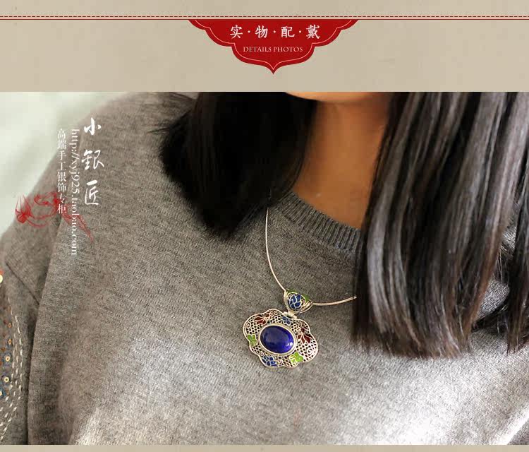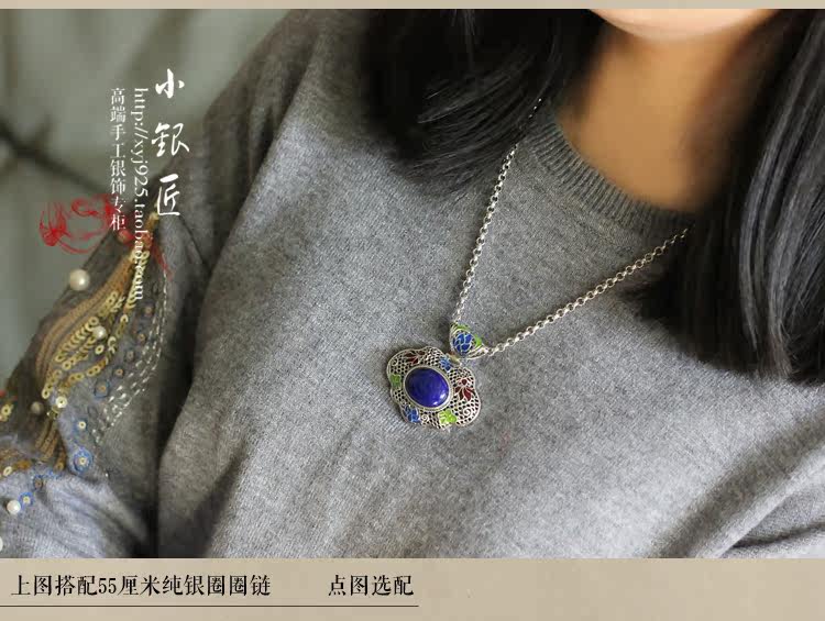 进口手工纯银 青金石泰银景泰蓝吊坠 复古长命锁 毛衣链坠子