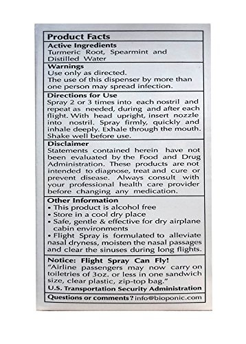 ReleaseDate : 2011-11-28 Studio : Bioponic Phytoceuticals Publisher : Bioponic Phytoceuticals Binding : Health and Beauty Product Description Flight spray is the first germ-fighting nasal hydration spray designed especially for airline travelers. Made in Maui from Hawaiian grown plants. Great for dry airplane cabin environments with 100% pure hydrosol and alcohol-free. Flight Spray moistens the nasal passages and alleviates nasal dryness, Flight Spray supports health and well-being. Flight Spray helps to enhance the body’s immune ability to fight against infection, and clears the sinuses during long flights. Flight Spray is formulated by combining two of the most effective herbal ingredients (Turmeric root and Spearmint) used in the treatment of nasal ailments. The ingredients provide an unsuitable environment for germs and viruses to reproduce. Effective at the first signs of nasal dryness, Flight Spray can be used on the go while traveling, in a crowd, or any time natural nasal relief is desired. We start with the finest herbs (Turmeric root and Spearmint) grown in Maui, Hawaii, and add pure water naturally filtered through ancient volcanic rock. Gently heating the mixture releases a vaporous steam that carries the plants unique molecular structure to condense and collect as the hydrosol essence. There are no preservatives used, only the pure natural herbs and water. Our production facilities use only the finest glass equipment, which gives our hydrosols their purity and distinct quality Experience the refreshing healing power of Flight Spray. 0