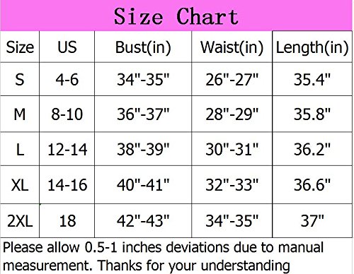 Measurements(inch): S(US4-6)----Bust 34-35"----Waist 26-27"----Length 35.4"