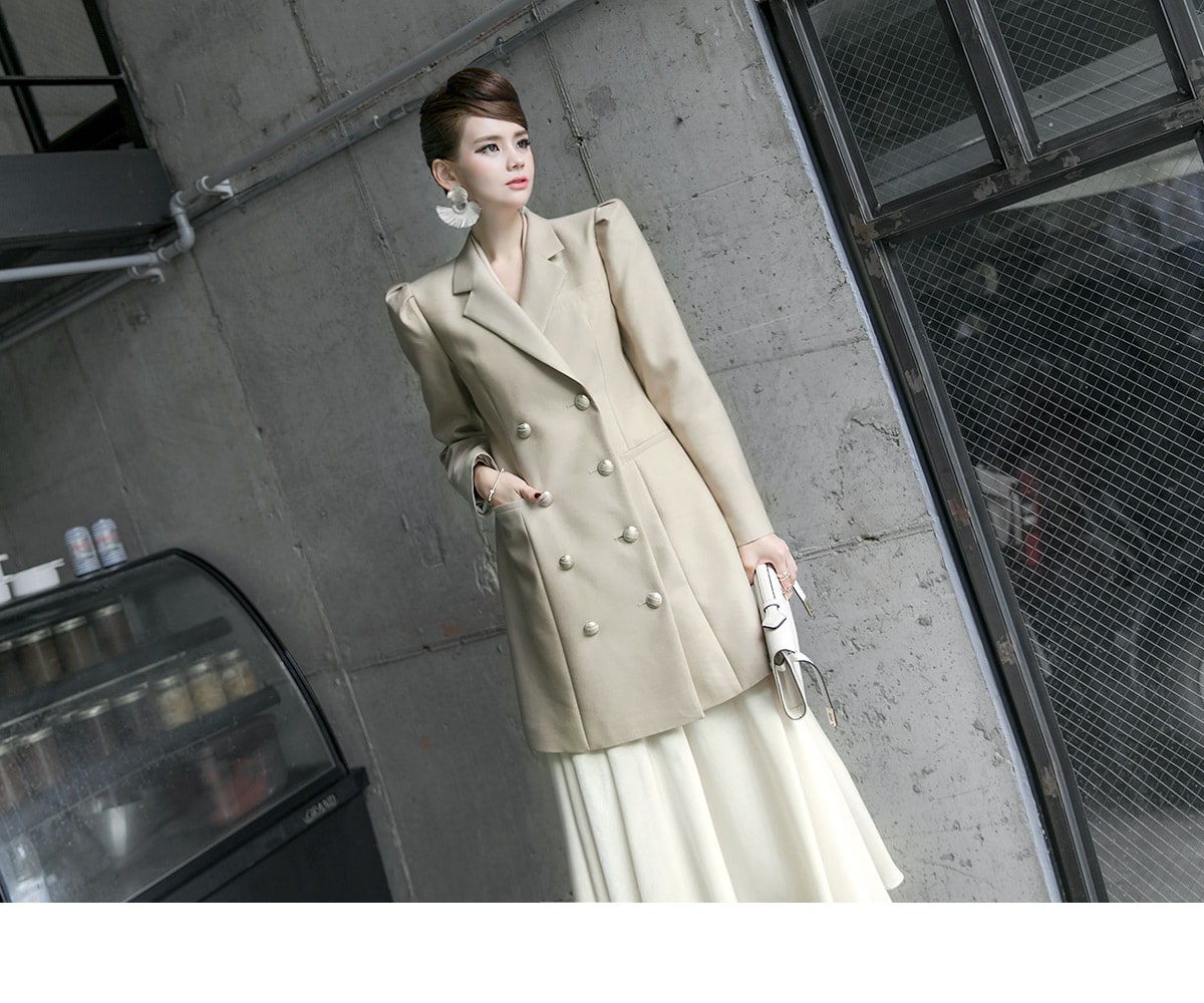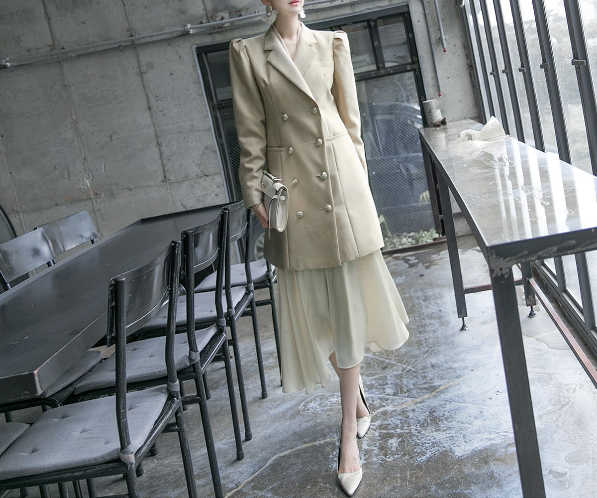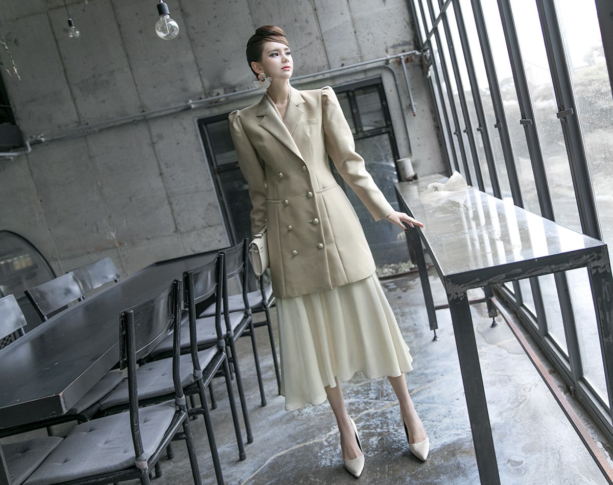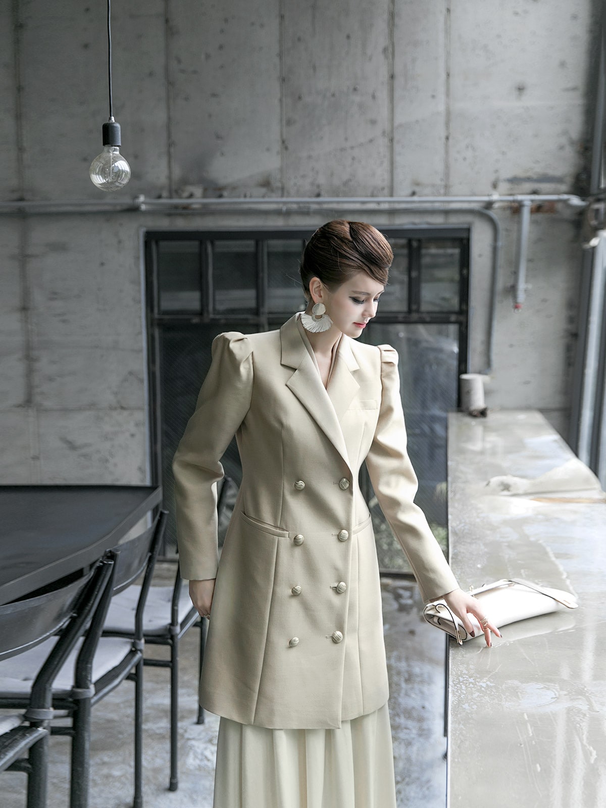 J-5022 로제 포인 숄더 더블 롱 자켓 Beige
