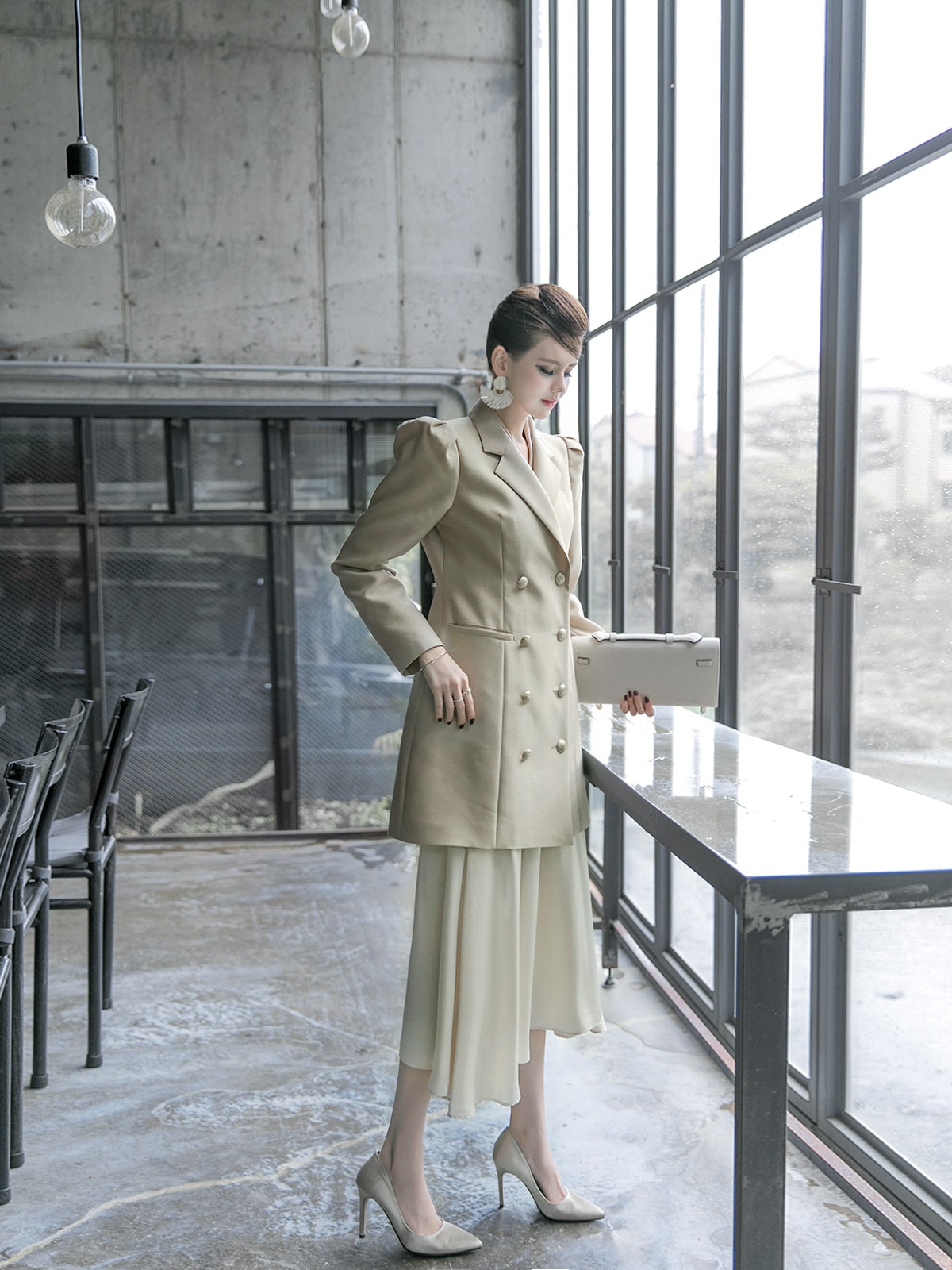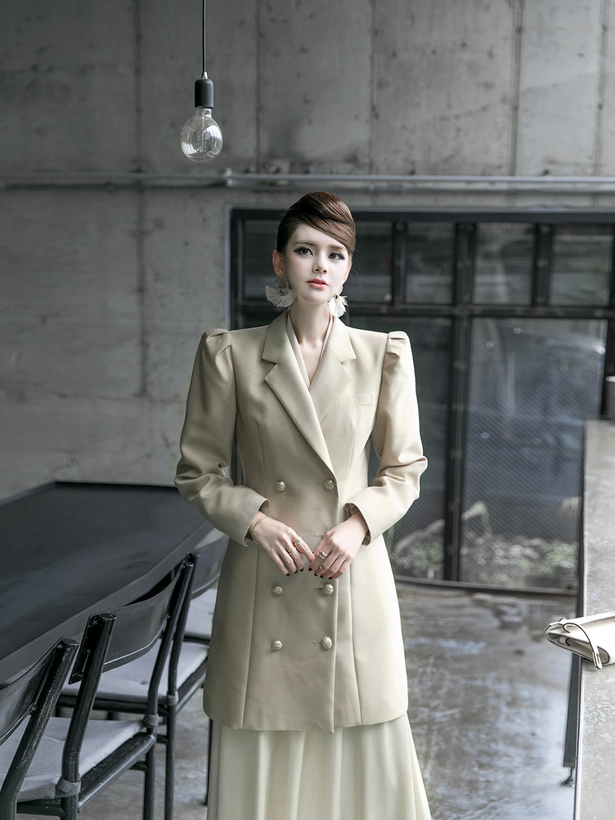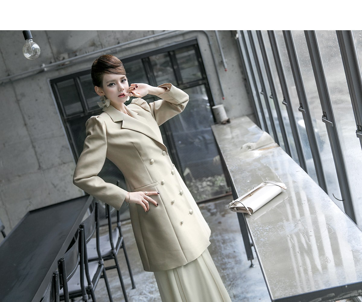 J-5022 로제 포인 숄더 더블 롱 자켓 Beige