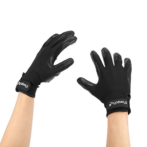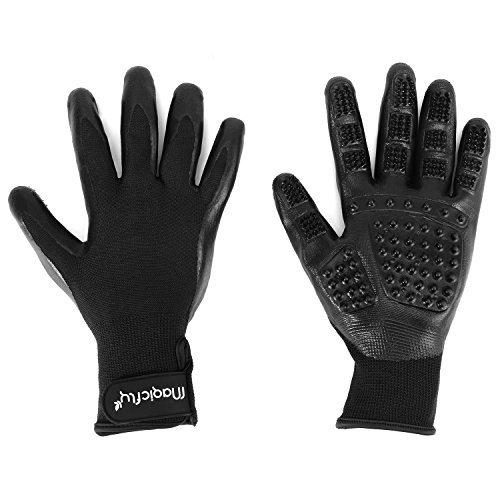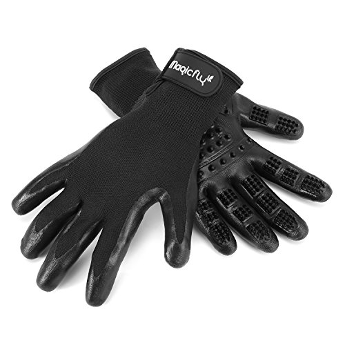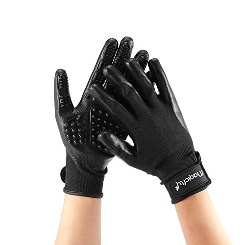 Studio : Magicfly Publisher : Magicfly Binding : Misc. Product Description Magicfly Pet Deshedding Glove Hair Remover Tool, Gentle Pet Massager Brush with Enhanced Five Finger Design, Perfect Pet Products for Dog Cat with Long Short Fur BENEFIT FEATURES OF MAGICFLY PET GROOMING GLOVE, Enjoy the hair removal with our multifunctional pet grooming gloves Enhanced Five Finger Gloves Design - Gently clean sensitive hard-to-reach places, like face, tail or legs 1.Adjustable Wrist Strap for a comfortable fit.(medium and large size for choosing) 2.Lightweight and breathable design, comfort not just for your pets, but also you. 3.Use them wet or dry - Palm coating will help to keep your hands and fingernails clean. 4.Machine Washable (Easy to Clean) 5.Scrubbing nubs provide relaxing massage for your pets. Gentle Hair Remover, Regular brushing removes loose hair and mats from your pet's coat. 6.Perfect for your lovely dogs, cats, horse or other pets. Package Includes: Pet Deshedding Glove x 2 (1 left-hand and 1 right-hand)