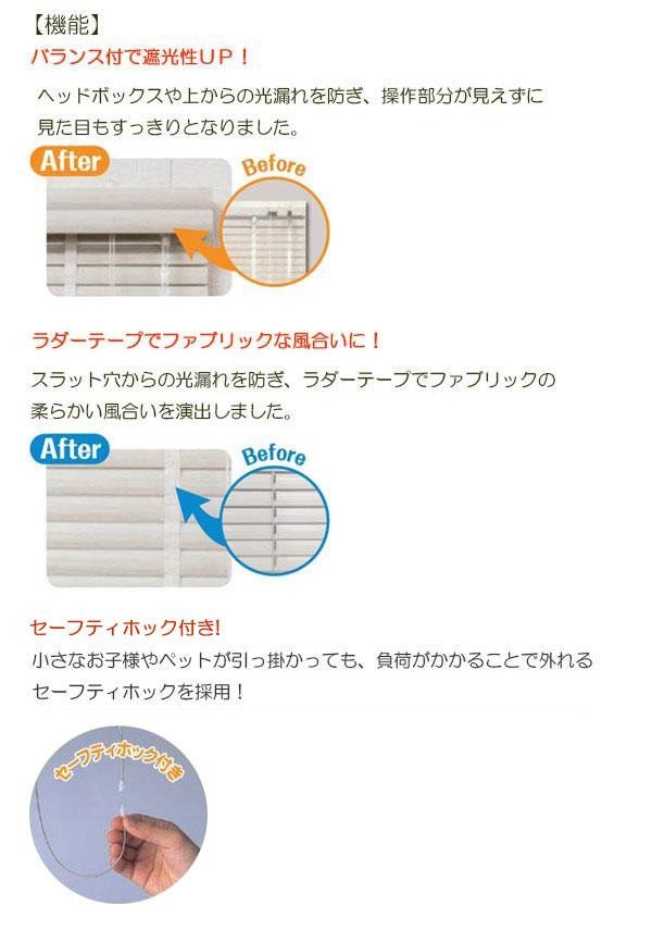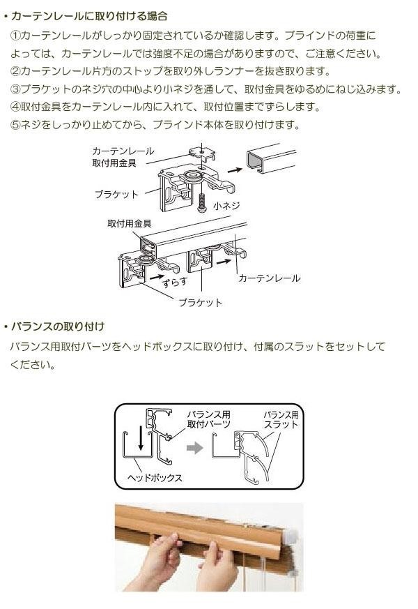 | セット内容 | アルミブラインド本体、ブラケット、木ネジ(ブラケット取付用)、カーテンレール取付金具、カーテンレール取付金具用ネジ、バランス用取付パーツ、バランス用スラット、取扱説明書 |