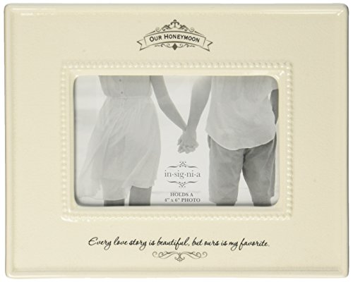 -. Feature : Elegant honeymoon photo frame made of durable stoneware with a delicate crackle finish / The intricate detail on the decal is done in a gold mirror finish and reads "Our Honeymoon" and below "Every love story is beautiful but ours is my favorite" / Offered by Enesco, manufacturing the most beloved home decor products for more than 50 years / Holds a 4 by 6 photo / Measures 7.625 H x 0.75 W x 9.5 L inches