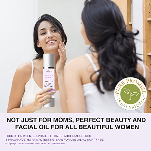 Potent 15+1 hydrating & nourishing formula known to help support skin elasticity, prevent stretch marks, soothe and moisturize dry, sensitive pregnancy skin, formulated for expecting moms, great for all women - Organic Olive Oil, Lavender Essential Oil, Organic Coconut Oil, Organic Jojoba Oil, Cold Pressed Rice Bran Oil, Organic Apricot Kernel Oil, Organic Sweet Almond Oil, Cold Pressed Rosehip Seed Oil, Cold Pressed Grapeseed Oil, Organic Witch Hazel, Organic Rosemary, Organic Chamomile, Organic Japanese Green Tea, Organic Arnica Extract, Vitamin EJojoba Oil -Highly beneficial to prevent the formation of stretch marks, can be applied in stomach, breasts, thighs and areas that are prone to stretching in pregnancy