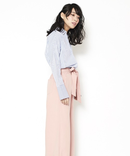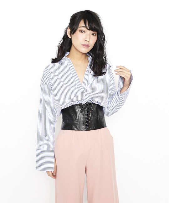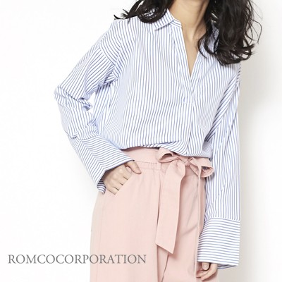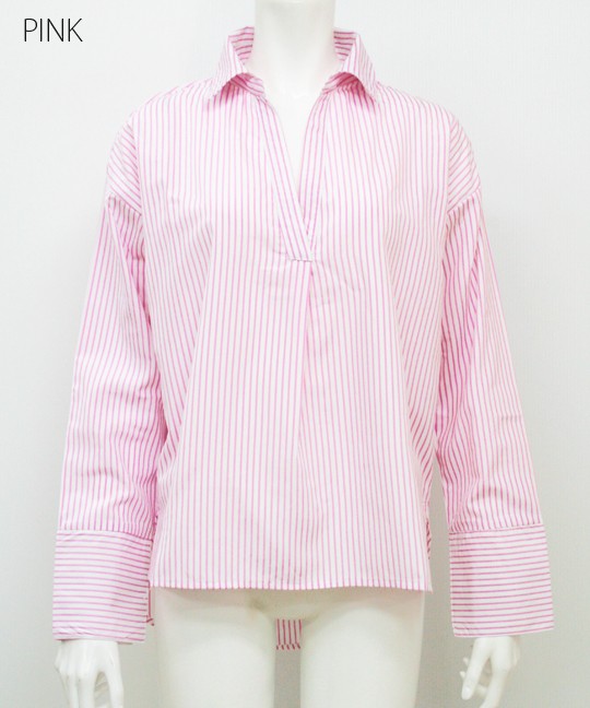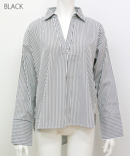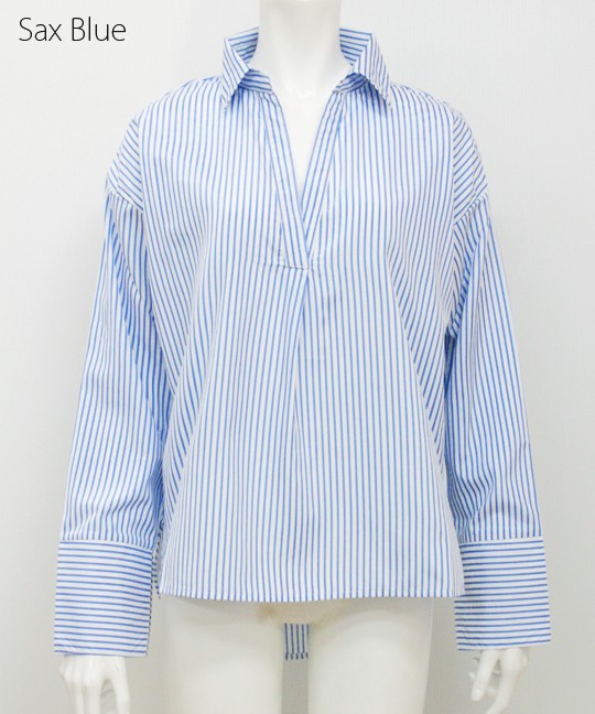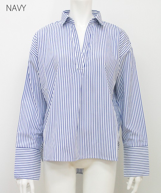 首元に抜け感のでる抜き衿になっていてデコルテ美人になれるスキッパーシャツ。