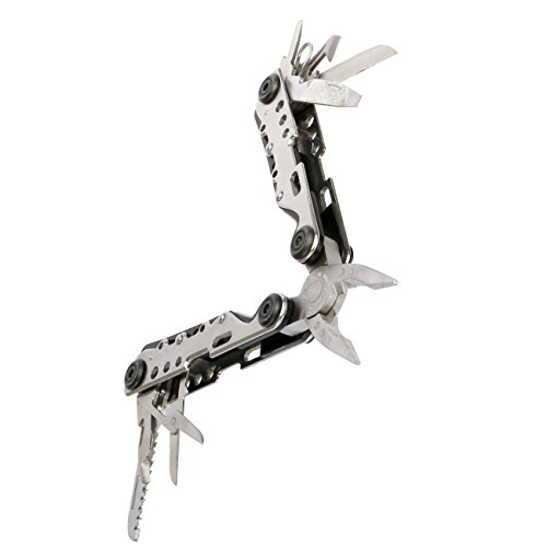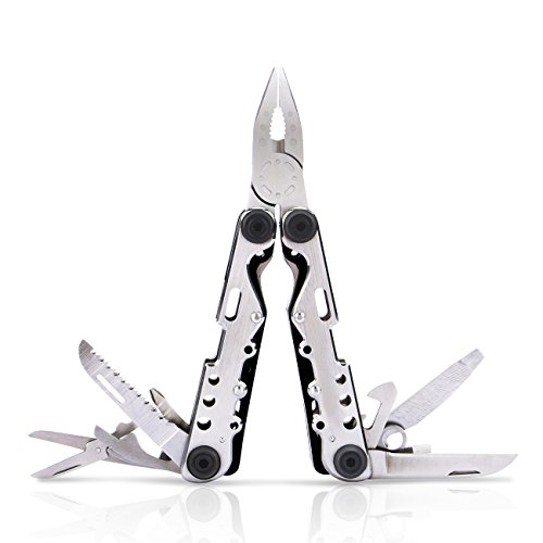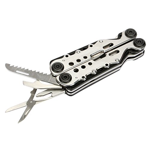 - 10 Tools Included-Needlenose pliers,regular pliers,wire cutters,large knife blade,bottle opener,medium slotted screwdriver,wood/metal file, key buckle,phillips screwdriver,scissors,saw blade,can opener.A survival card tool is also included as a gift.