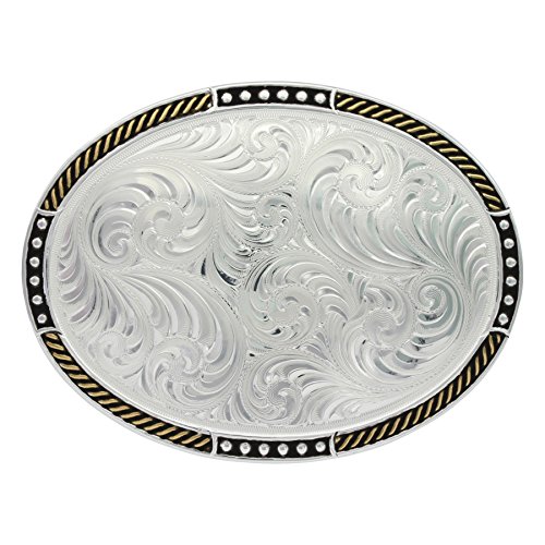 Binding : Apparel Product Description A standard two tone oval buckle with an alternating gold finished twisted rope and silver finished medium bead trim. The center has bright-cut silver finished engraving. Standard 1.5 inch belt swivel.