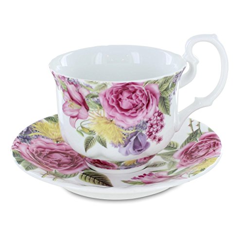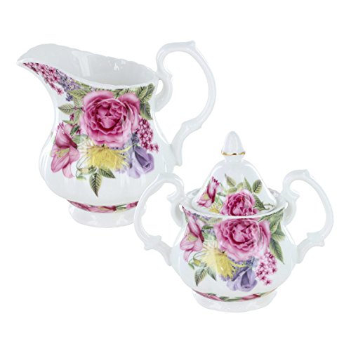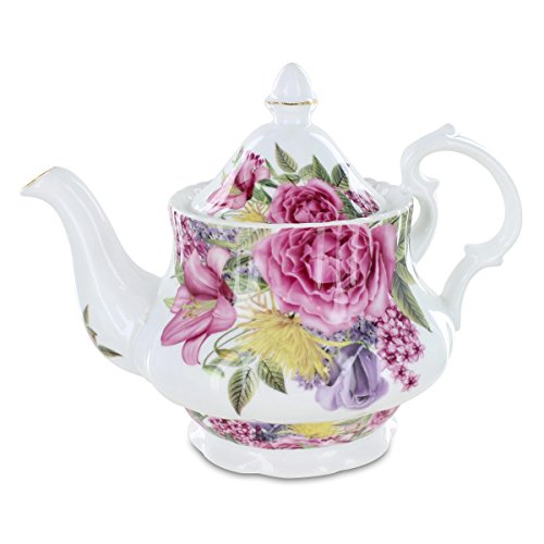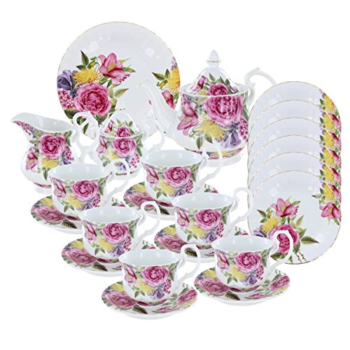 Studio : English Tea Store Publisher : English Tea Store Product Description From the Floral Pageant Porcelain Collection, this 24 piece tea set is decorated in the same beautiful pattern as the rest of our Floral Pageant line. Featuring gold trim, each piece is decorated on white porcelain with a stunning pink, purple, and yellow floral design. This set is sure to be a hit at your next family gathering, holiday, or just because. Not recommended for dishwasher or microwave use due to the gold trim. Each Deluxe Set Includes: Six 7.5 inch Salad / Dessert Plates Six Cups with Matching Saucers, Capacity 7 ounces One 10.5 inch Serving Plate Tea Pot with lid, Capacity 38 ounces Sugar (with lid) and Creamer set Sugar bowl capacity: 12 ounces Creamer capacity: 10 ounces 0
