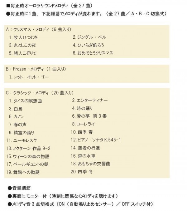 | アナと雪の女王の世界観を表現した優美なからくり時計。ファンが愛する「レット・イット・ゴー」のメロディーをお楽しみいただけます。飾りには雪の結晶をモチーフに、アナと雪の女王の世界を凝縮感のある商品に仕上げました。スワロフスキー(R)・クリスタルを飾りに使用しています。 |