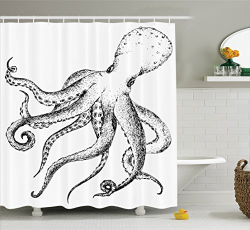 Ambesonne Octopus Decor Collection, Hand Drawn Style Image of Octopus Marine Wildlife Nature Print Nautical Decorative Art, Polyester Fabric Bathroom Shower Curtain, 84 Inches Extra Long, Black White