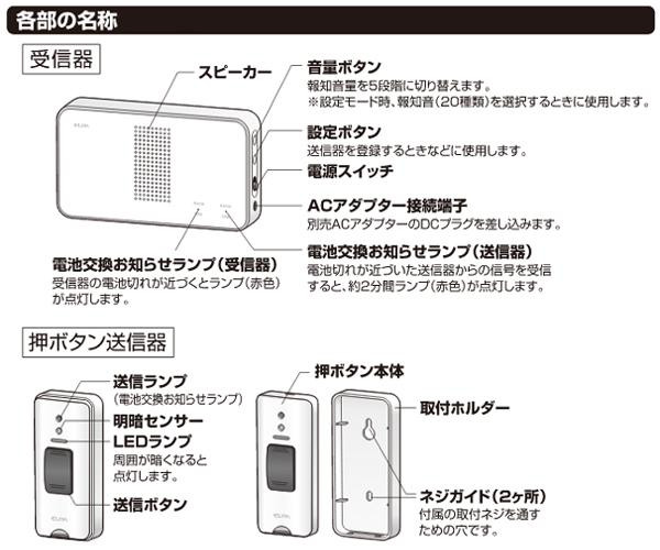 防雨タイプの押ボタン送信器と受信器のセットです。 製造国:中国 商品サイズ:受信器:幅142×高さ80×奥行29mm(最大値)、送信器:幅40×高さ91×奥行19mm(最大値) 重量:受信器:約138g(電池除く)、送信器:約38g(電池除く) ※サプライヤー直送品 ご注文後3~4営業日後の出荷となります【商品名】ELPA(エルパ) ワイヤレスチャイム 受信器+押ボタン送信器(グレー)セット EWS-S5031