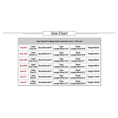 ★ NOTE: Attention plz: If your kid is chubby, we recomend choosing a larger size, Please compare the detail sizes with yours before you buy!Thanks. ★ Size Details (1 "= 2.54cm): ★ Size:6M Label Size:0-6 Bust:53cm/20.9" Tops Length:32cm/12.6" Pants Length:37cm/14.6" Height:60CM ★Size:12M Label Size:6-12 Bust:55cm/21.7" Tops Length:34cm/13.4" Pants Length:40cm/15.8" Height:70CM ★Size:18M Label Size:12-18 Bust:57cm/22.5" Tops Length:36cm/14.2" Pants Length:43cm/17" Height:80CM ★Size:24M Label Size:18-24 Bust:60cm/23.7" Tops Length:37cm/14.6" Pants Length:46cm/18.1" Height:90CM ★Size:3T Label Size:3Y Bust:62cm/24.5" Tops Length:39cm/15.4" Pants Length:50cm/19.7" Height:100CM ★Size:4T Label Size:4Y Bust:65cm/25.6" Tops Length:42cm/16.6" Pants Length:54cm/21.3" Height:110CM ★Size:5T Label Size:5Y Bust:68cm/26.8" Tops Length:44cm/17.3" Pants Length:58cm/22.9" Height:120CM 0