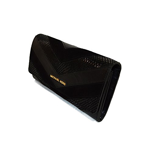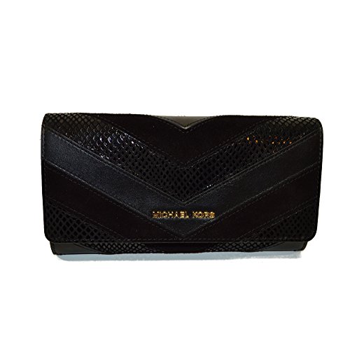 Product Description Michael Kors Jet Set Travel Lg Gosset Carryall Emb Leather Python Black striped pattern. snap closure, gold tone hardware,10 c.card spaces,4 bill slots,center zip pocket, rear exterior slip pocket 0