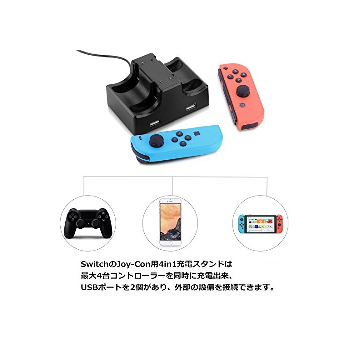 「4in1동시 충전」 Joy-Con을 스탠드로 세우는 것만으로,최대4대동시에 충전 가능한Switch Joy-Con충전 스탠드입니다.또한2개의 USB포토 부착에,다른 게임기나《스마호》나 PS4콘트롤러에 접속해 충전으로 옵니다.