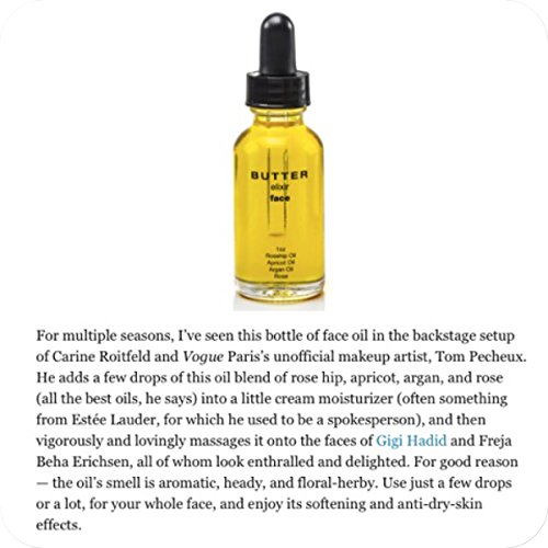 BUTTERelixir face oil is a gentle and hydrating face oil that is perfect for all skin types to allow you to become the most beautiful version of yourself. Rose Hip oil is paired with Argan oil and Apricot Kernel oil to create a light and easily absorbed moisturizer that is perfect for daily use. Rose essential oil unifies the formula with its fragrant hug. Housed in a clean and sturdy glass 1-ounce, a sensitive, easy to use eyedropper allows for the perfect amount to be applied with each use. • Ingredients: Apricot oil, Rosehip oil, Argan oil, Rose essential oil. 100% Natural.Apply 2/3 drops daily for the perfect glow.