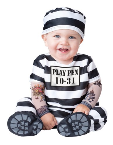 -. Brand : In Fashion Kids -. Color : Black -. Department : unisex-baby -. Feature : After trick or treating, it's back to the pen for your Infant Inmate. This adorable Baby Prisoner Costume is hilarious! We love this unique baby Jailbird costume for Halloween! Playpen no more your Infant Convict has escaped in his/hers Time Out Costume! / Cap and jumpsuit with attached mesh tattoo sleeve, / snaps for easy diaper change / skid resistant feet -. ProductGroup : Apparel -. ProductTypeName : BABY_COSTUME -. Title : Incharacter Unisex-baby Jailbird Prisoner Halloween Costume