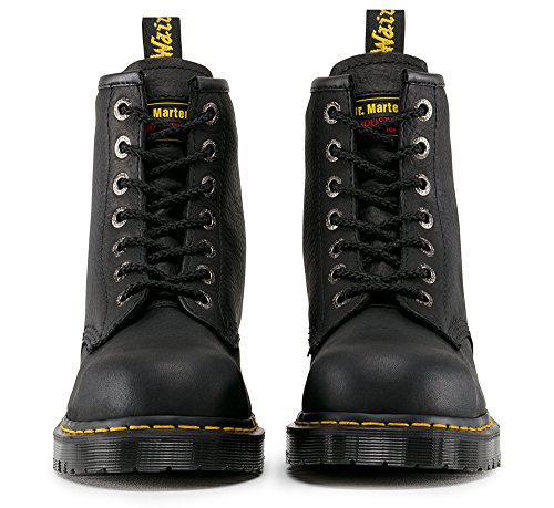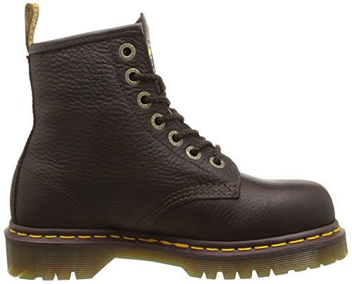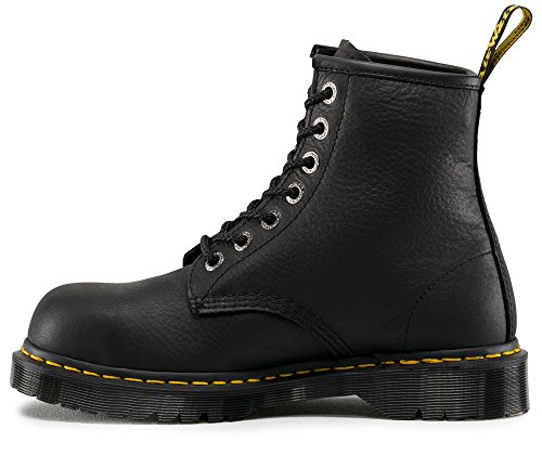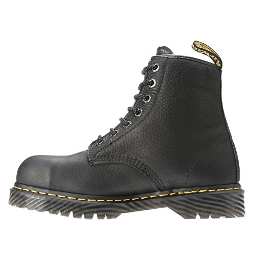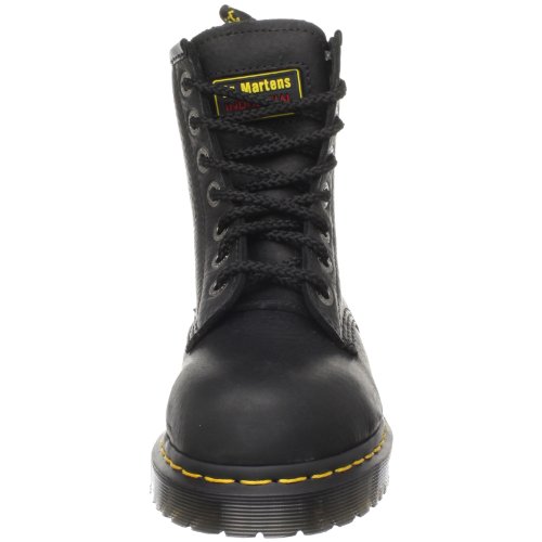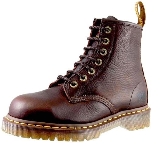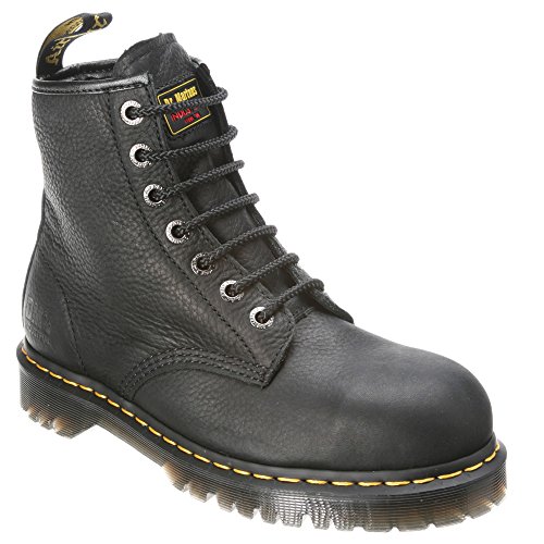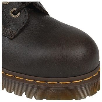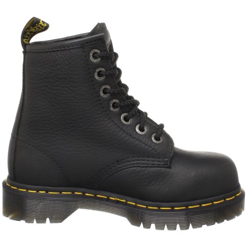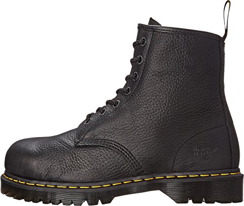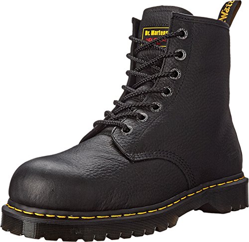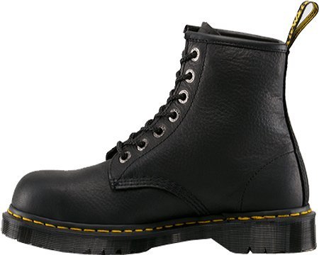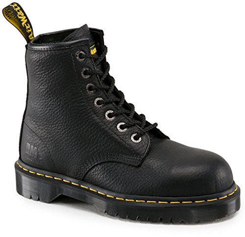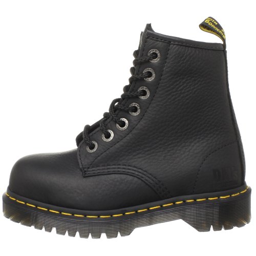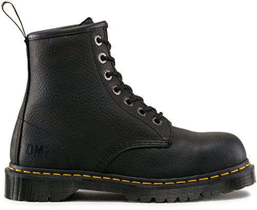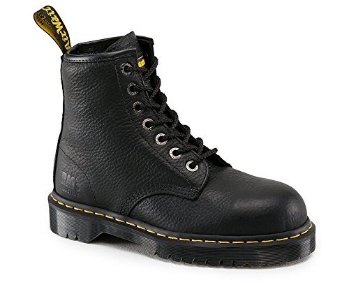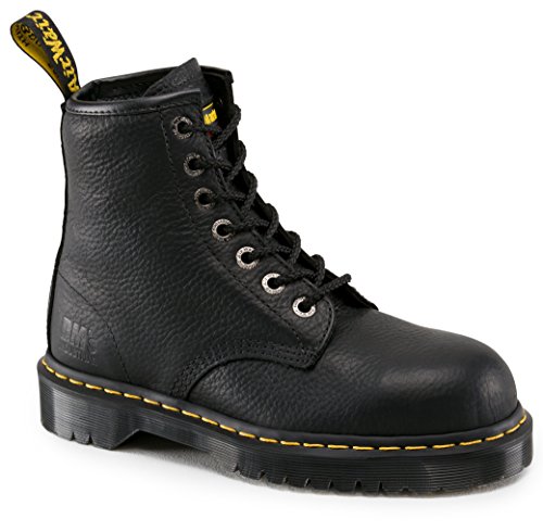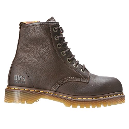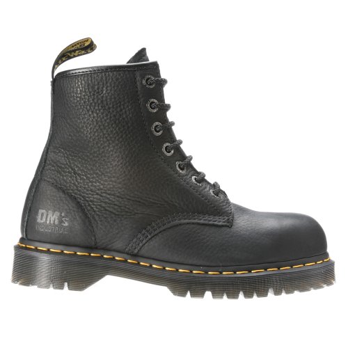 Amazon.com Product Description Get your work done with this 7B10 ST steel toe 7 boot from Dr. Martens. A tough leather upper, durable rubber outsole and iconic yellow stitching are all expected features. However, the heavy duty metal eyelets and lace carriers, industrial strength cord lacing and Cosmo moisture wicking lining are unexpected features. This boot is slip resistant to oil, fat, petrol and alkali with a standard wood shank.