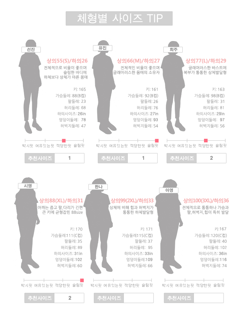 55에서 66까지 분들께는 1사이즈를,77에서 88까지 분들께는 2사이즈를 추천해 드려요.자세한 사이즈는 상세 사이즈 표를 참고해 주세요^^