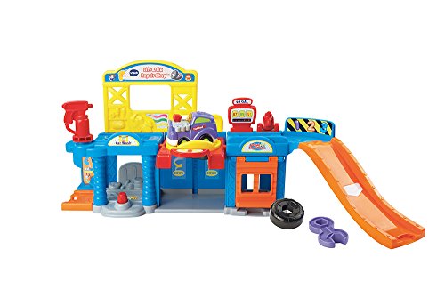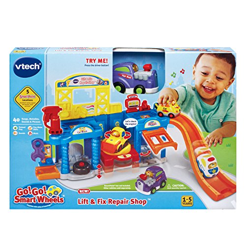 Go! Go! Smart Wheels interactive toy repair shop has motor skill building features including a paint station, car wash, fueling station, parking garage and a repair lift;