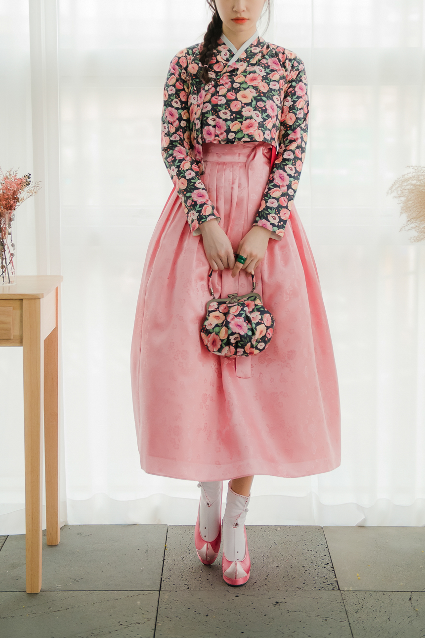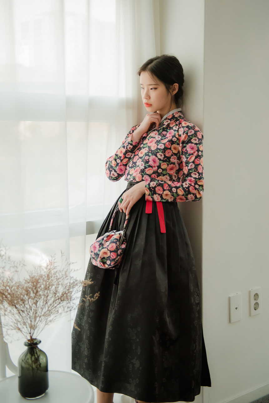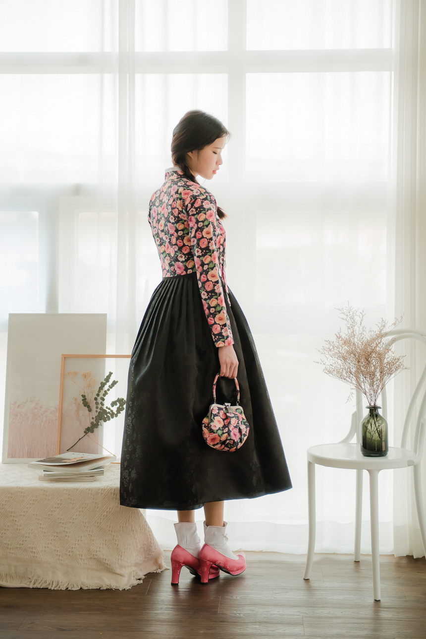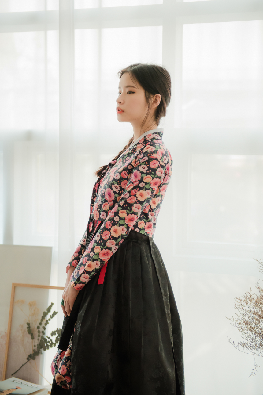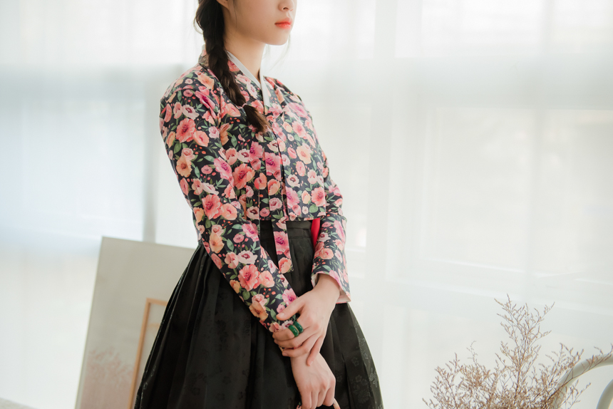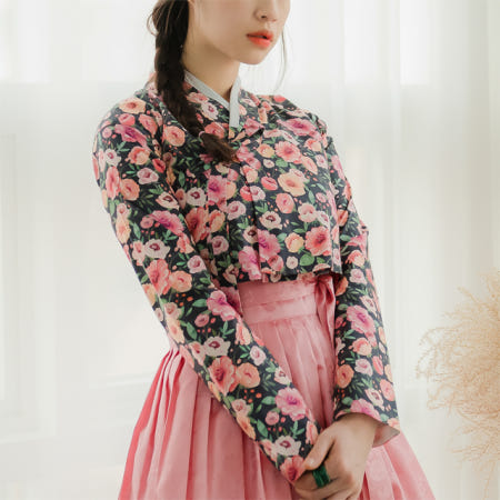 분홍빛 오렌지빛 달리아 꽃송이들이 차분한 블랙바탕위에 가득 채워져 있는 저고리입니다.
