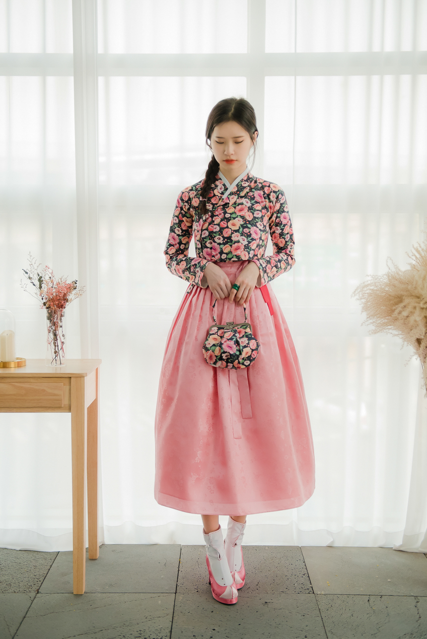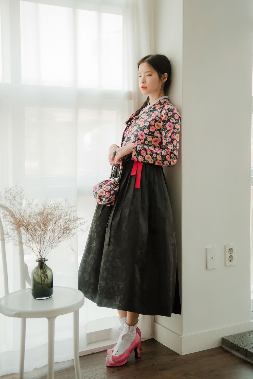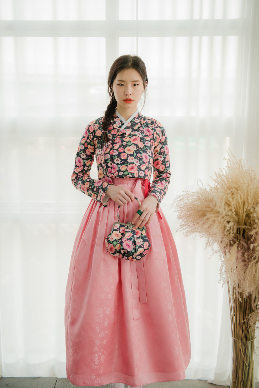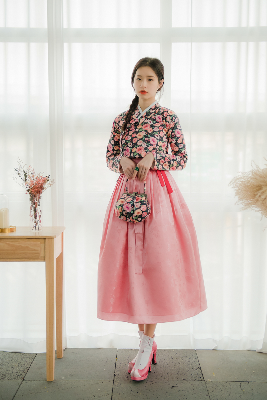 분홍빛 오렌지빛 달리아 꽃송이들이 차분한 블랙바탕위에 가득 채워져 있는 저고리입니다.
