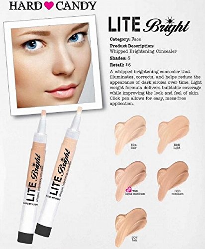 -. Binding : Misc. -. Brand : Hard Candy -. EAN : 8111160973096 -. Feature : A whipped brightening concealer that illuminates, corrects, and helps reduce the appearance of dark circles over time. / Light weight formula delivers buildable coverage while improving the look and feel of skin. Click pen allows for easy, mess-free application. -. IsAdultProduct : 0 -. MPN : AB-128895 -. PackageQuantity : 1 -. PartNumber : AB-128895 -. ProductGroup : Beauty -. ProductTypeName : BEAUTY -. Title : HARD CANDY Lite Bright Brightening Concealer - Tan