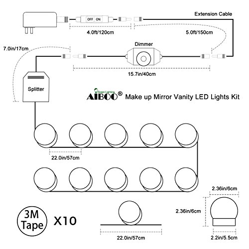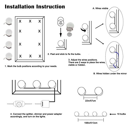 @ EASY TO INSTALL: Coming with strong adhesive 3M tape Velcro for each light bulb. Just peel and stick to the mirror or the mirror frames.