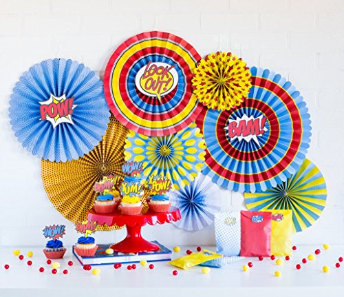 -. Feature : There is no stress when it comes to My Mind's Eye Superhero pre-folded party fans. / Simply open up the fans and hang! Fans include tape and paperclips for hanging. / Easy to assemble and reuse, they are the perfect fun touch for all occasions. / The quick and easy DIY way to decorate your home or use for parties and events. / Includes 8 coordinating colorful patterned double-sided paper fans with 2 die cut signs. Fans include 2 each of the following sizes: 17" 11" 14" and 8 inch.
