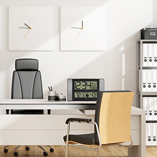Stylish atomic digital clock is packed with many features and offers modern look to add to your living room or kitchen. Outdoor temperature display receives wireless data from weather-resistant transmitting sensor within a 300 ft (91 M) range, down to -40 F. Large, 2 inch tall time digits set automatically to your time zone selection and adjust to daylight savings, all on an easy to read LCD with calendar display & moon phase. Clock indicates active alarm, WWVB signal, and low/weak battery with adjustable display language. Mount clock onto wall or fold-out leg stand to place on table.Feature