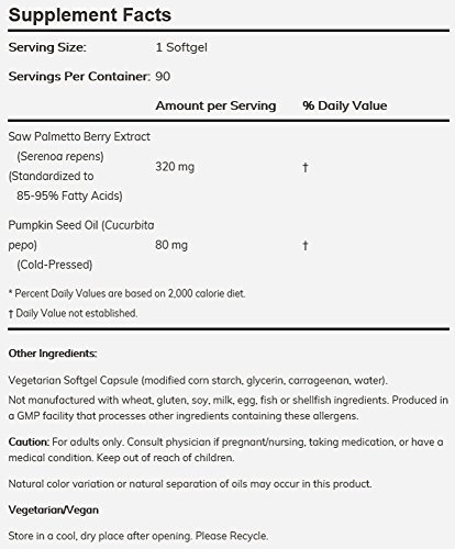 -. Feature : Formulated with high potency (320 mg) Saw Palmetto standardized extract with added cold-pressed pumpkin seed oil / Vegetarian/Vegan / Saw Palmetto (Serenoa repens) is a low-growing palm tree native to the southeastern United States. Saw Palmetto contains a number of beneficial compounds, including flavonoids, sterols and fatty acids that may support prostate health.* / Not manufactured with wheat, gluten, soy, milk, egg, fish or shellfish ingredients. Produced in a GMP facility that processes other ingredients containing these allergens. / Made in the USA in a GMP-certified facility.