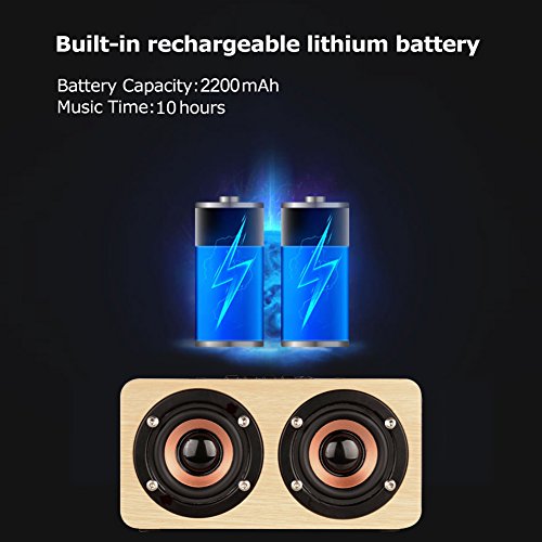 -. Feature : Extended play - With a built-in Li-On 2200 MAH rechargeable battery enables up to 10 hours of extended play. Charges fully in just 2 hours with the micro USB cable included. It can also be used as emergency power bank to charge the phone or similar light devices / Wireless portable bluetooth speaker: Enjoy a High Definition stereo sound with a impressive volume whether you're lounging around the house,or partying,walking out,camping,hiking,biking with included waterproof travel pouch / Humanized and Fashionable design with solid performance: Hand-built audiophile grade MDF wood cabinet suppresses resonance for accurate response, increased warmth and an overall more natural sound. Also you can choose what's easiest for you - control sound, volume and tracks with a button on the top of the speaker / Feel more powerful beat and Stunning Stereo Sound: Two highly powerful 52mm total 10W acoustic drivers produce a wide audio spectrum. The dedicated bass port could provide strong bass without distortion even at highest volume / Portable speaker - With extraordinary stereo volume, you can enjoy your music wherever you are, parties, boating, camping, fishing, even hiking, its portable