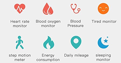 -. Feature : Material of the strap: Silicone non-toxic for the environment, in conformity with the norms of the European and American market. / Waterproof Level: IP67 waterproof (suit for swimming or shower). Compatibility: Android 4.4 or higher, iOS 8.0 and higher. / Main Function: Heart Rate Dynamics and Blood Pressure Monitor, Blood Oxygen Monitor, Incoming Call Reminder, SMS App Notifications Reminder. / Heart rate detection: Low power consumption, all-day support monitoring rate. Independent motion detection: a key to start motion monitoring (including heart rate and motion details). Blood pressure test: intelligent blood pressure test(Not for medical use).