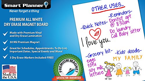-. Feature : NEVER FORGET A THING: The Smart Planner's white board lets you write just about anything. Keep yourself or family on track with appointments, shopping lists, birthdays and more, improving communication between family members regarding important times and dates. / GO AHEAD, WRITE, SKETCH, OR DOODLE! Featuring an ultra-strong back magnet, you can attach this schedule organizer to any magnetic-friendly surface which makes it easier for family members to update one another on trips, outings or events. / SUPERIOR MAGNET STRENGTH: Each of our dry erase calendar's magnets are 30 mils stronger than your average kitchen refrigerator magnet or dry erase board, meaning you never have to worry about it slipping, sliding or falling. / • STRUCTURE AT HOME OR WORK: Keep your home, office or business running more smoothly thanks to our versatile, removable calendar that can be used with dry erase markers or wet erase markers for enhanced to-do lists. / • MONEY BACK GUARANTEE: We're out to provide customers with the very best magnetic dry erase board possible, which is why our products are backed by a 30-day money back guarantee and superior customer service.
