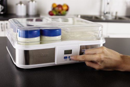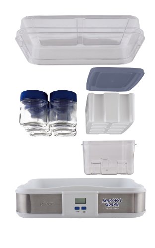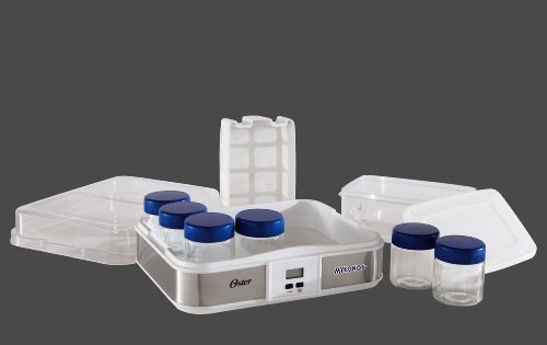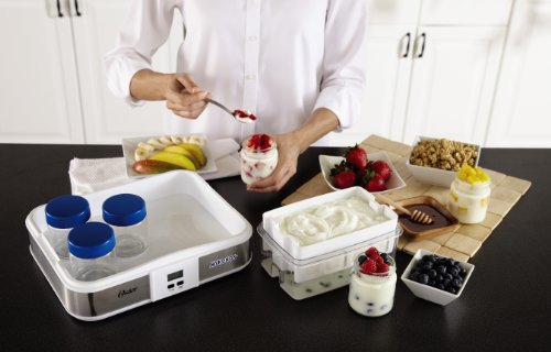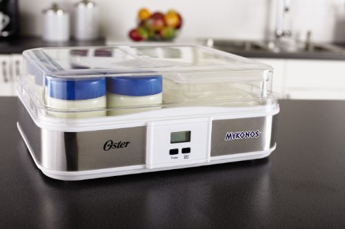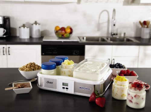 Did you know Greek yogurt contains up to twice the amount of protein compared to traditional yogurt? Also, Greek yogurt is made by simply straining out liquid whey, so only the protein-rich whey solids remain. Everything you need to create Greek yogurt is included in this easy-to-use Oster CKSTYM1012 Mykonos Greek Digital Yogurt Maker. The Oster Mykonos Greek Yogurt Maker can produce one large batch or can be made as individual servings using the glass jars and lids provided. Recipes include the most popular varieties of milk from whole, reduced fat and skim - as well as soy and almond milk for vegan and lactose-free diets. Depending upon the type of milk used, cook time ranges from 10-12 hours. Cooking overnight or while you're away at work is recommended. In just a few easy steps, you can prepare fresh, homemade yogurt exactly how you like it and save money too! Making your own Greek yogurt at home can save up to 80% vs. store bought Greek yogurt per year. Includes yogurt maker with digital LCD display and timer function, set of 6 - 7oz. glass jars with lids, large 1 qt. plastic container/lid and Greek yogurt strainer. Pieces store neatly in unit. *Note for Customers Outside of North America. Some of our products use electricity for power. We sell electrical products that were made to work with 110V Electrical systems. If you live in a country that utilizes a different electrical system you may need to use a converter for these products to function. The act of using a converter automatically voids the warranty on these products.Feature