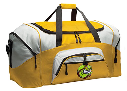 Product Description This large deluxe Softball duffel bag is great as a Softball gym bag, or as a Softball luggage bag suitcase. This deluxe Softball Duffel Bag is loaded with useful features such as large zippered pockets on each end, two outside pockets, and an easy access d-shaped double zippered top opening This great Softball Duffle Bag has an adjustable detachable shoulder strap, padded carry handles and tough 600 Denier fabric construction. (Size: 13.5" x 27.25" x 14.5") 0