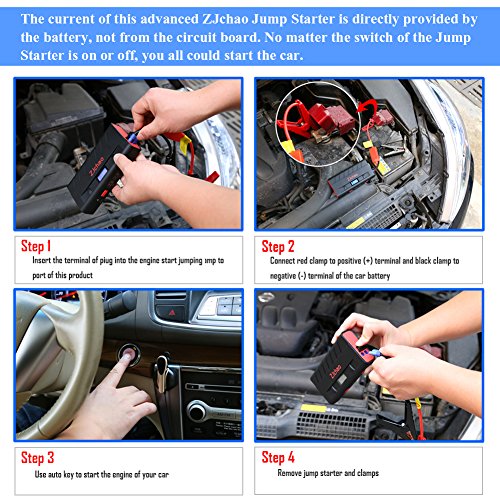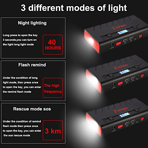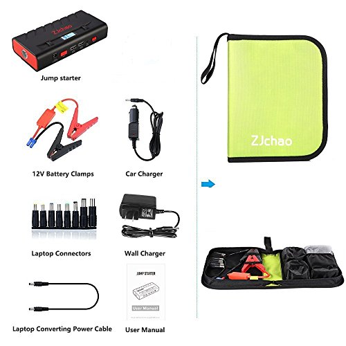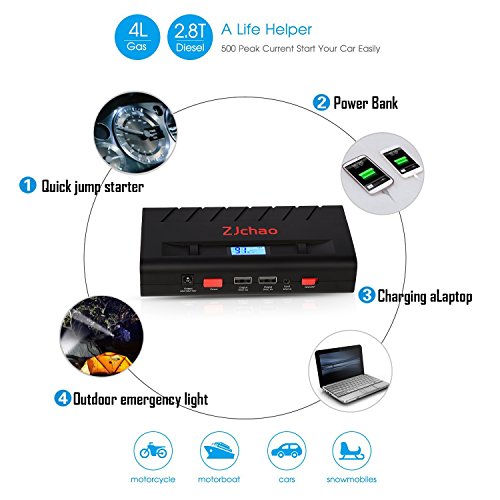 - Feature : 1:Portable Power Bank: 13600mAh rechargeable battery capacity; USB 5V/2.1A ports designed for safely charging iPhone, smart phone, Android, MP3/MP4, Able to jump start 4.2L gasoline turbine and 3.0L following diesel turbine,Able to achieve the highest 500A peak current / 2:MULIT FUNCTIONAL POWER BANK. Comes with 4-in-1 USB Cable and 8 universal laptop charging tips allows you to charge your portable devices. 2 USB 5V/2.1A ports designed for safely charging iPhone, smart phone, Android, MP3/MP4, camera and PSP simultaneously. And 12/10V Adjustable Output for tablets, laptops / 3:ZJchao CAR JUMP STARTER can jump starter all 12V, ≤ 4.0 L ENGINE TYPES. Automatically identify voltage and current with smart Clips, strong crocodile clips and tailor-made control box, very safety.Ensures total protection against reverse polarity, surges and short circuits; With built-in emergency flashlight / 4:LED FLASHLIGHT For ILLUMINATION AND OUTDOOR SURVIVAL. Press the switch 3 seconds to start. If you want to use LED for illumination and select the status (light, strobe, SOS, close) by pressing the switch to transform / 5:INTUITIVE MULIT MODE LCD DISPLAY. Easy to view charge level and output current at a glance, and selecting the appropriate voltage and connector for the electronic device to charge / power supply. 30 DAY MONEY BACK GUARANTEE!!!12-month warranty and friendly customer service!