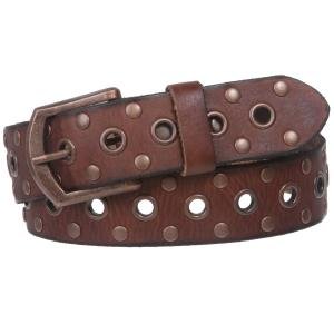 *This leather belt, oil-tanned, soft hand feeling, vintage, distressed looking, with grommets and studs hardware decoration down the strap, features snap on removable buckle, optional for you to switch any of your favorite buckles. Color: Available in Brownish Black with antique silver color hardware as pictured, Brown with copper color hardware.Notes: the size chart does not include buckle length. It is recommended to select size matches measurement of your waist or where you wear this belt. It would be more comfortable to select a size that is about 1" or 2" bigger than the actual measurement of your waist or where you wear this belt.Feature