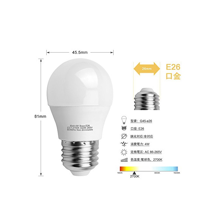 원본상품명: LED電球E26口金 Aooshine G45 LED 配光タイプ 270角度 2700K電球色(4w) 密閉形器具 非調光 AC85-265V 400im (セット:6個入り) …