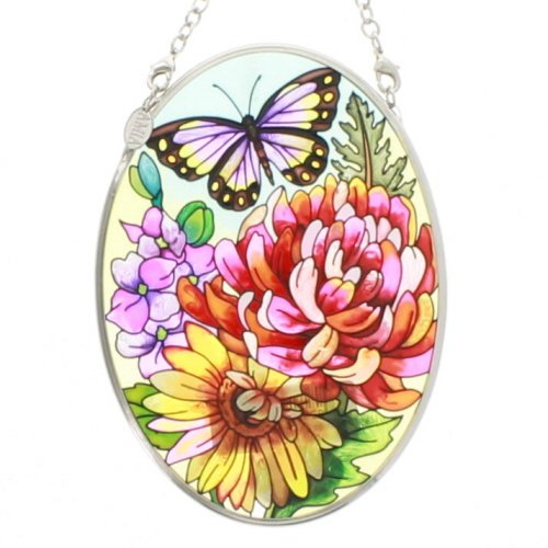 Amia Hand Painted Glass Suncatcher with Butterfly Floral Design, 3-1/4-Inch by 4-1/4-Inch Oval