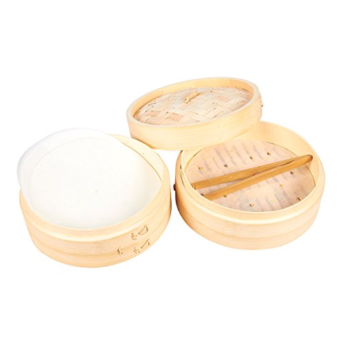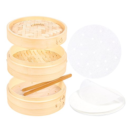 This bamboo steamer set includes all you need to eat healthy including a 2-Tier bamboo steamer, 30 parchment liners and a bamboo tong. Cook vegetables, meat, seafood, poultry and more! This bamboo steamer provides quick and efficient cooking while sealing in nutrients. Not just for cooking, you can also use it toheat up meat, veggies, pasta, rice, quinoa and more! The included tongs and perforated parchment liners make using this bamboo steamer a breeze! Steamer and tongs are made from food-safe, 100% natural bamboo. Parchment liners are FDA approved and heat resistant up to 482 degrees Fahrenheit. It is recommended to use a steamer rack to ensure the longevity of the bamboo steamer.Feature