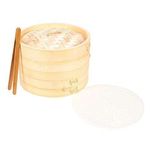 BAMBOO STEAMER SET: Includes all you need to eat healthy including a 2-Tier bamboo steamer, 30 unbleached perforated parchment liners and a bamboo tong. Cook vegetables, meat, seafood, poultry and more! Provides quick and efficient cooking while sealing in nutrients.