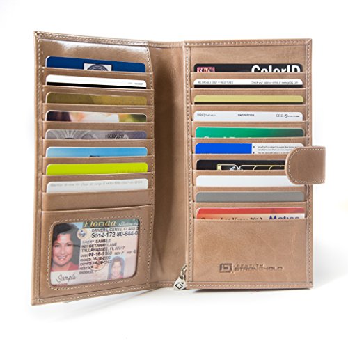 -. Feature : AMAZING STORAGE. This wallet features 19 card slots including a clear ID window with thumbhole. It also has a large, zippered change compartment, and two billfolds which run the full length of the wallet, and a snap closure. Truly a shopaholic's dream, you can have all your store rewards cards with you when you need them. Carry your health card, insurance card, and auto club cards with you. No need to keep some cards at home; you'll have room for everything with this fashionable clutch. / STAY ORGANIZED. With everything you need at your fingertips, you are ready for anything. One of our newest additions to the ID Stronghold line, this luxurious women's high capacity leather clutch with zippered coin area will quickly become a new favorite. Features fine details such as the original ID Stronghold shield zipper pull. / GENUINE LEATHER. Exquisite craftsmanship and fine details, hardware, and leather quality not found in other wallets in this price range. The credit card organizer features the ID Stronghold metal logo plate on the front, logo zipper pull and debossed leather logo inside, so you can rest assured knowing your credentials are electronically secured. This wallet looks and feels great, making you look and feel great too! / EVERY SLOT SHIELDED to protect your Credit Card, Debit Card, Enhanced Driver's License, Transit Card, Hotel Room Key, Passport Card, etc. transmitting at 13.56 Mhz and higher. Designed with top security in mind. As with all ID Stronghold wallets, every slot, ID window, billfold, and compartment is individually shielded, so your information is protected, no matter where you place your RFID cards, even when the wallet is open. This feature is not found in most RFID wallets. / PERFECT GIFT! Each wallet comes with its own original ID Stronghold GIFT BOX so you can buy one for yourself, and one for a friend. Looking for something different? Just search for ID Stronghold at the top of Amazon to find all of our styles. OUR PROMISE - If, for any reason, you do not love your Brand New Wallet, we will refund 100% within 30 days. No questions asked. Buy now RISK-FREE. Product Dimensions: 7.75 x 4.25 x .875 inches • Product Weight: 6.21 ounces