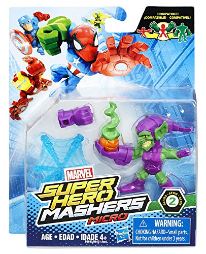 -. Binding : Toy -. Brand : Marvel -. Feature : Make the ultimate hero mash-up with the customizable Hero Mashers Micro Series 2 figures featuring Hulk, Green Goblin, Black Panther, Star Lord, Hulkbuster Ironman, and Ghost Rider. / These Marvel Super Hero Mashers Micro figures are customizable and include 3 connection points allowing kids to detach head and arms, then reconnect them where they want! / Universal connectors let kids swap parts with other Super Hero Mashers figure, giving them the freedom to create their own superhero mash-up! / Additional connection points allow kids to attach battle gear and accessories to amp up the mash-up! / Approx. 2.5" Scale -. IsAdultProduct : 0 -. Label : Hasbro Toys -. Manufacturer : Hasbro Toys -. ProductGroup : Toy -. ProductTypeName : TOYS_AND_GAMES -. Publisher : Hasbro Toys -. Studio : Hasbro Toys -. Title : Marvel Super Hero Mashers Micro Series 2 Green Goblin 2" Action Figure