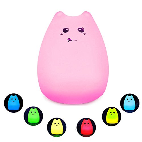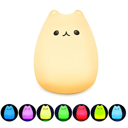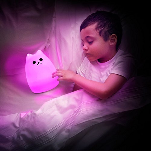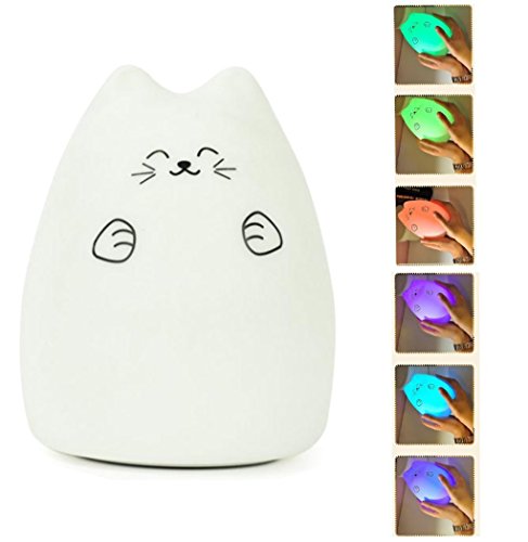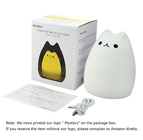 Features: * Note: For this night light, now we changed the light mode to three modes (if you buy this item after October 26th, 2016, then would be the 3-modes one). * 3 Light Modes: Warm White Light, 7 single colors mode and 7-Color Flashing Modes * Sensitive Tap Light Control * Lovely Kitty Face Made by BPA-free Washable Soft Silicone * Handheld Size and Standing Design for Flexible Placement * Warm Soft Light Offers Tender Guardian * 12-Hour Portable Usage Supports All-Night Companion Specification: * Material: Silicone+ABS * Model: GL-NL003 * Power: 0.4W * Input: 5V/400mA * Battery: 1200mAH Lithium * Charge Port: Micro USB * Item Size: 122X 122X 153mm * Work Life: 50000 hours * Portable Usage: 15 hours in normal white light mode; 12 hours in colorful breathing mode Note: We have printed our logo " Mystery" on the package box. If you receive the item without our logo, please complain to Amazon diretly. Package includes: * 1X LED Multicolor Night Lamp * 1 x USB Cable * 1 x User manual Instructions: * Charge the night lamp fully by the packed USB cable before usage; * Press the main power button on the bottom to turn it on and the lamp will stay at normal warm white light mode; * Tap the silicone surface to switch to auto 7-color breathing mode, single color mode, standby mode and then back to normal white light mode successively; * If you want to turn off the lamp, please press the main power button again. Welcome to our store * May you have a pleasant shopping experience! * Our products have been well tested, examined and packaged before sending off. * Any problem please feel free to contact us first so that we can supply the best service for you.Feature