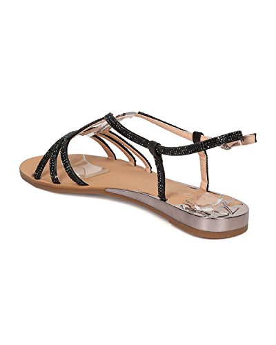 Product Description These dazzling sandals are made with a mixed media upper, open toe and keyhole detail at vamp. Also made with a low metallic plated heel and slingback strap with adjustable buckle closure. 0
