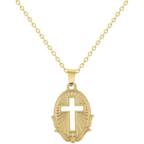 -. Title : 18k Gold Plated Oval Cross Medal Religious Baby Kids Pendant Necklace 16"